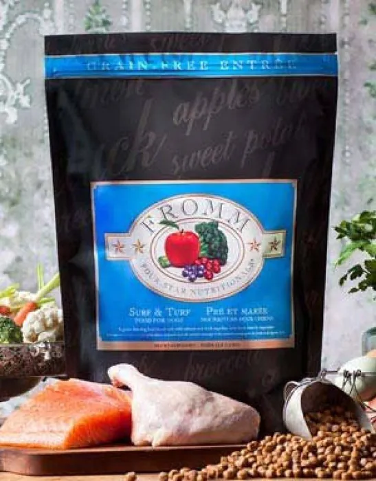 Keeping the needs of your dog in mind, Fromm Four Star Surf and Turf Dry Dog Food is made to support the all breeds in all stages of life. Made with high amounts of protein and paired with fresh produce including sweet potatoes and carrots to provide high quality, easily digestible carbohydrates. Fromm Four Star Grain Free Surf and Turf Dry Dog Food provides well rounded, balanced nutrition for your furry friend without the unnecessary fillers! This recipe also supports the health of your dog‰ۡó»s coat and skin with guaranteed levels of Omega fatty acids and is enhanced with probiotics to ensure that their digestion is right on track! Fromm Four Star Grain Free Surf and Turf Dry Dog Food is grain free and made with quality ingredients found in the United States with no artificial colors, flavors, or preservatives that any pup is sure to love!
