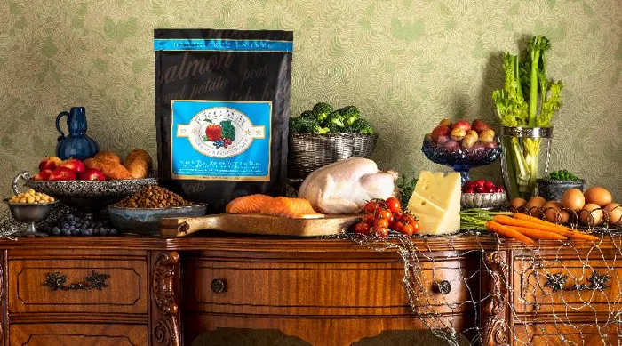 Salmon, duck meal, potatoes, pea flour, sweet potatoes, duck, chicken fat (preserved with mixed tocopherols), dried tomato pomace, salmon meal, dried whole egg, pea protein, chicken, flaxseed, cheese, salmon oil (preserved with mixed tocopherols), chicken broth, carrots, broccoli, cauliflower, apples, green beans, chicken cartilage, potassium chloride, cranberries, blueberries, salt, chicory root extract, alfalfa sprouts, yucca schidigera extract, sodium selenite, folic acid, taurine, parsley, sorbic acid (preservative), Vitamins [vitamin A acetate, Vitamin D3 supplement, Vitamin E supplement, Vitamin B12 supplement, choline bitartrate, niacin supplement, d-calcium pantothenate, l-ascorbyl-2-polyphosphate, riboflavin supplement, thiamine mononitrate, pyridoxine hydrochloride, biotin], Minerals [zinc sulfate, ferrous sulfate, manganese sulfate, magnesium sulfate, copper sulfate, cobalt carbonate, calcium iodate, iron proteinate, zinc proteinate, copper proteinate, manganese proteinate, magnesium proteinate, cobalt proteinate], dried Lactobacillus acidophilus fermentation product, dried Bifidobacterium longum fermentation product, dried Lactobacillus plantarum fermentation product, dried Pediococcus acidilactici fermentation product.