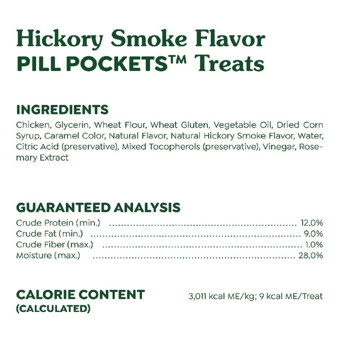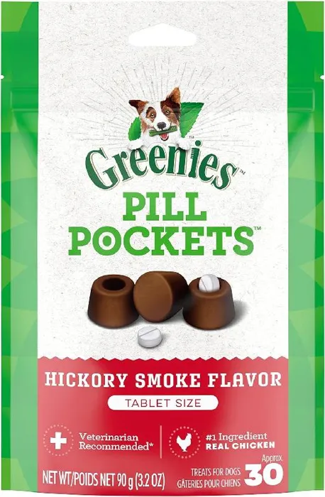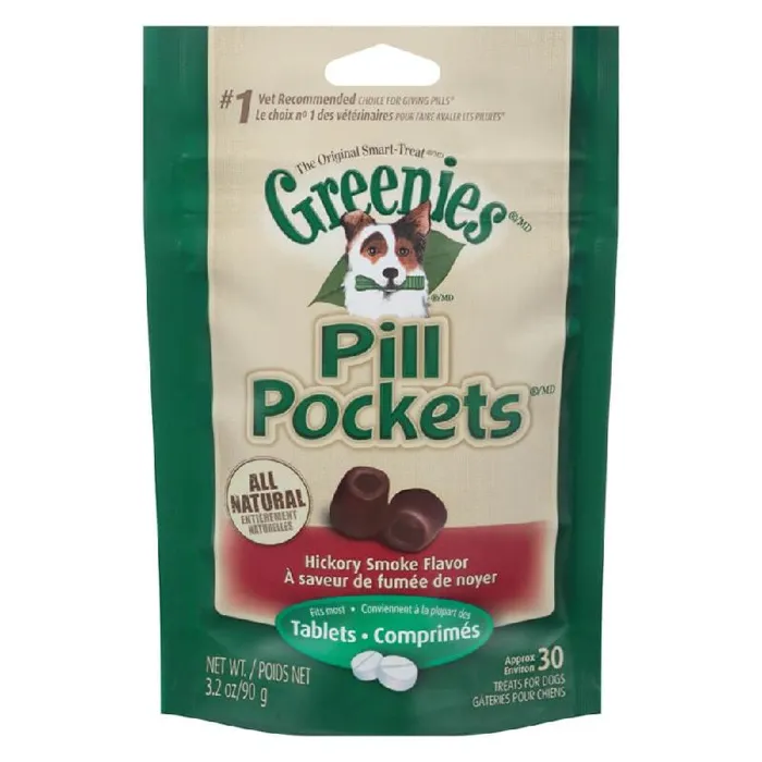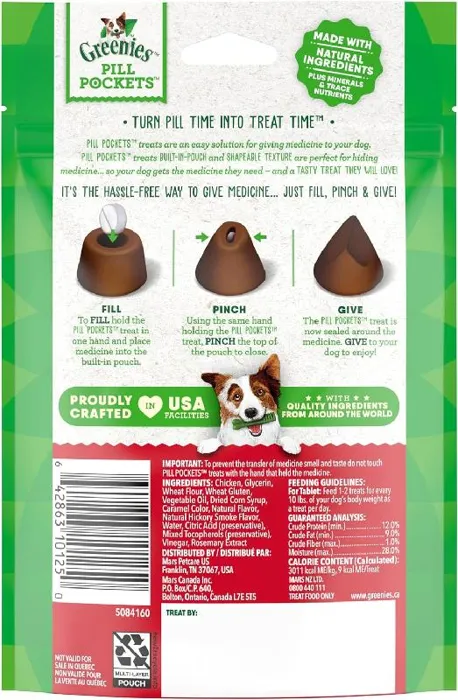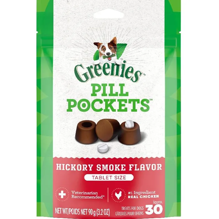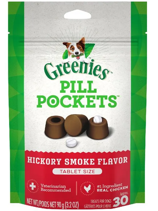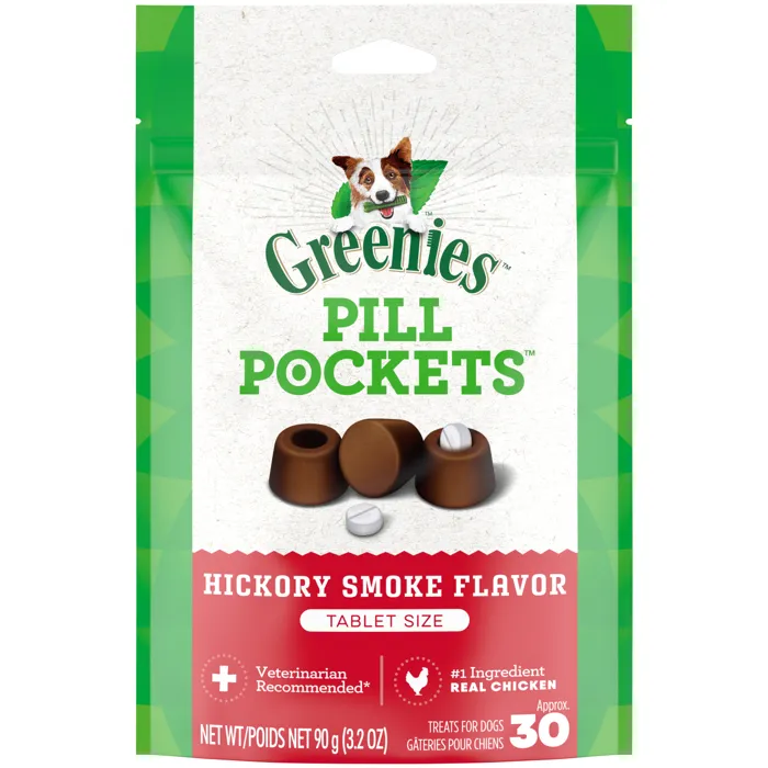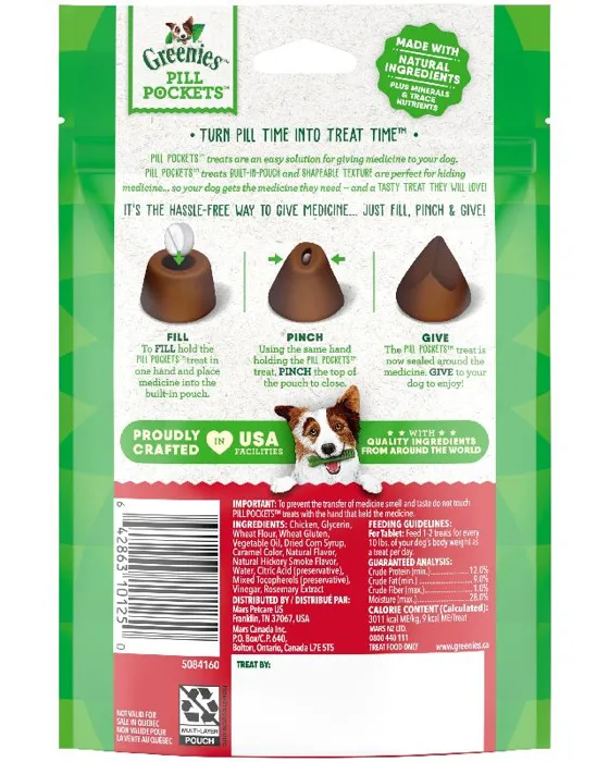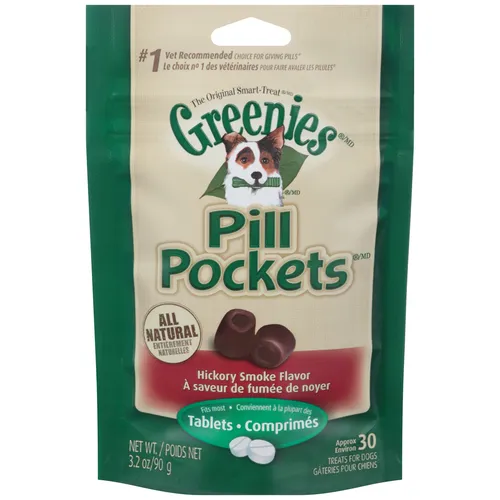 Giving your pup medication no longer has to be a hassle! Greenies Pill Pockets Canine Hickory Smoke Flavor Dog Treats are the perfect, low calorie way to disguise pills and eliminate the stress of giving your furry companion medicine. Greenies Pill Pockets Canine Hickory Smoke Flavor Dog Treats mask both the smell and taste of the pills put inside!