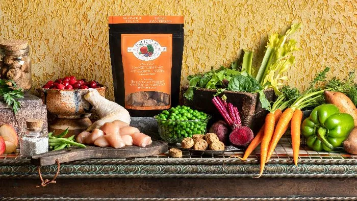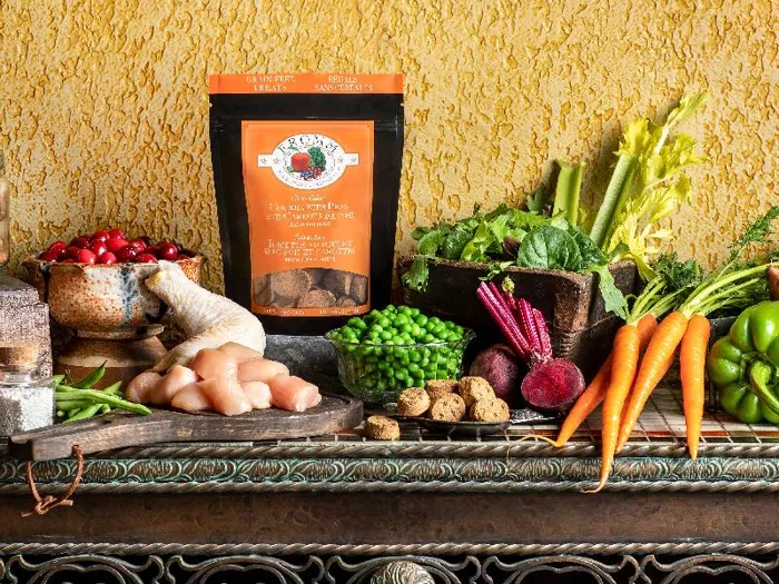 Crunchy oven-baked treat made from chicken with whole peas and carrots.